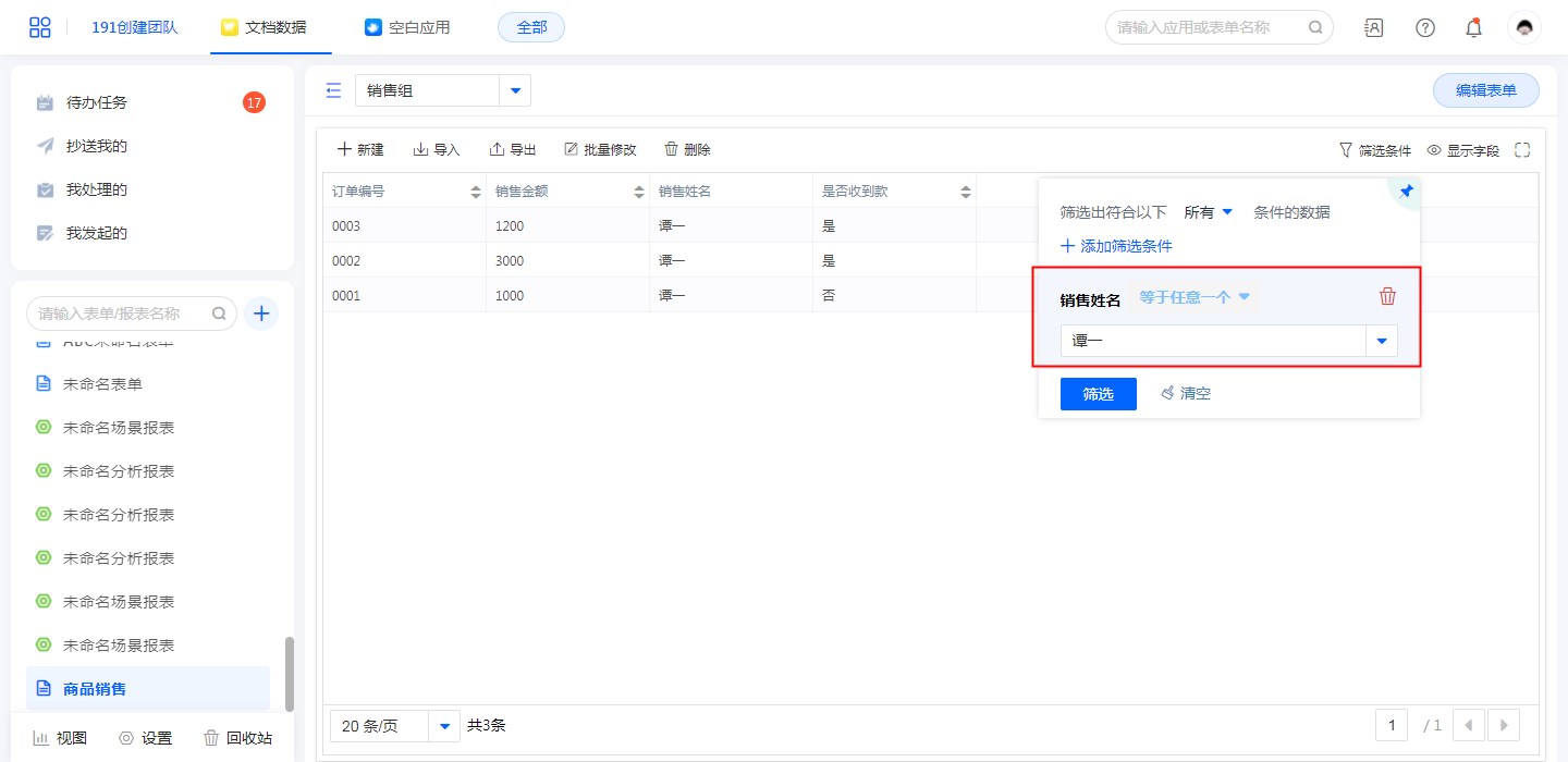 在【销售组】的数据列表里,可以查看数据、显示所需字段、新建数据。