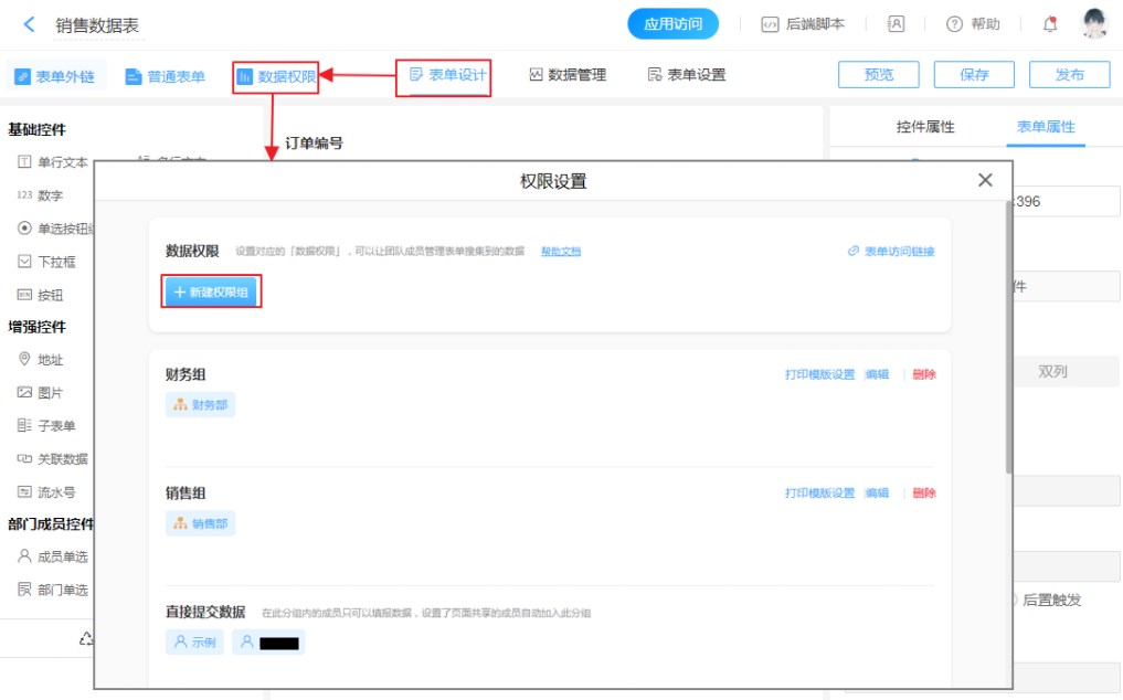 步骤:【应用编辑页面选择目标表单】——【数据管理】——【点击权限设置】——【添加自定义权限】