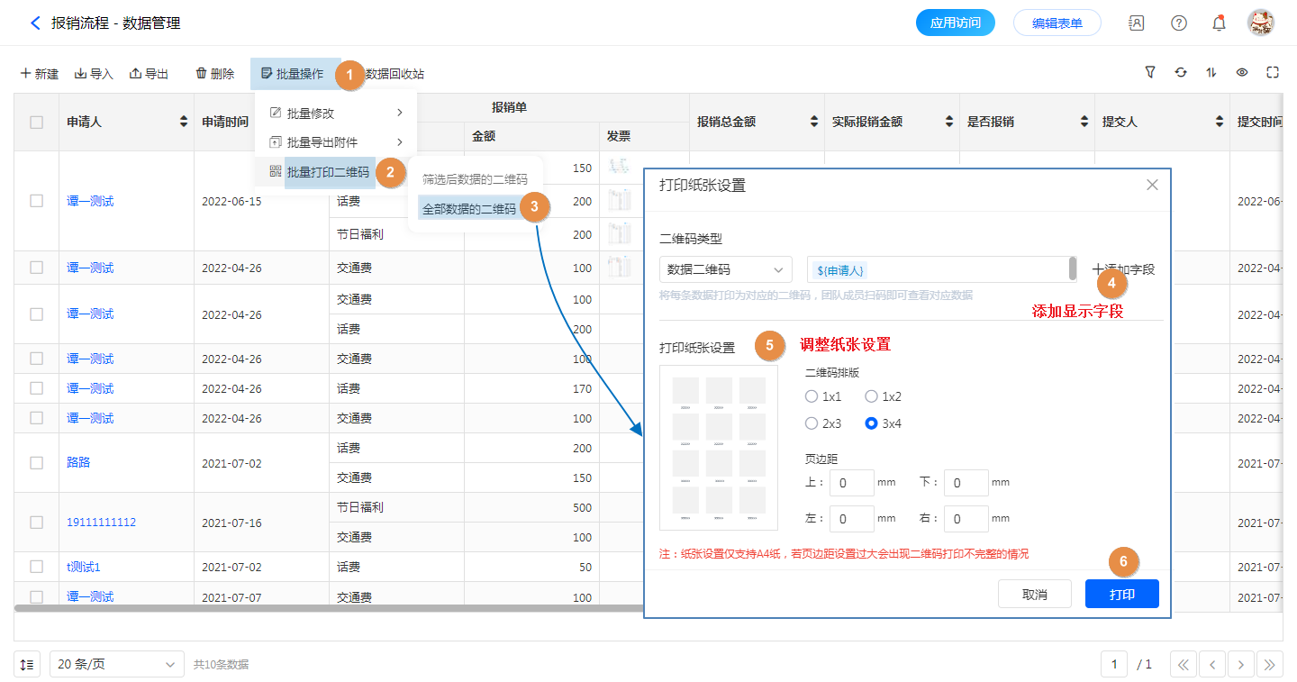 - 打印筛选后的数据:管理员登录,【表单访问】——【数据管理】,设置筛选条件得到筛选结果,【批量操作】——【批量打印二维码】——【打印筛选后的数据】——【打印纸张设置】——【打印】