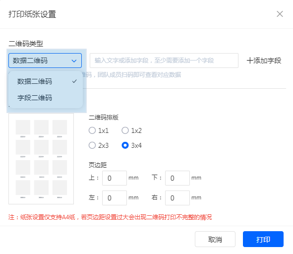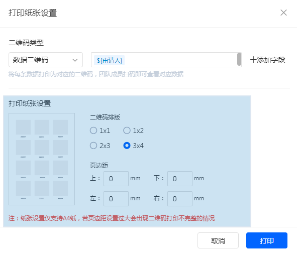 注:纸张设置仅支持A4纸,若页边距设置过大会出现二维码打印不完整的情况