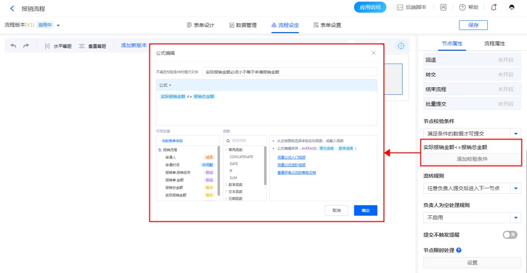 在【领导审批】这个节点设置节点校验条件,实际报销金额必须小于等于申请报销金额,数据才可能从该节点往下提交。