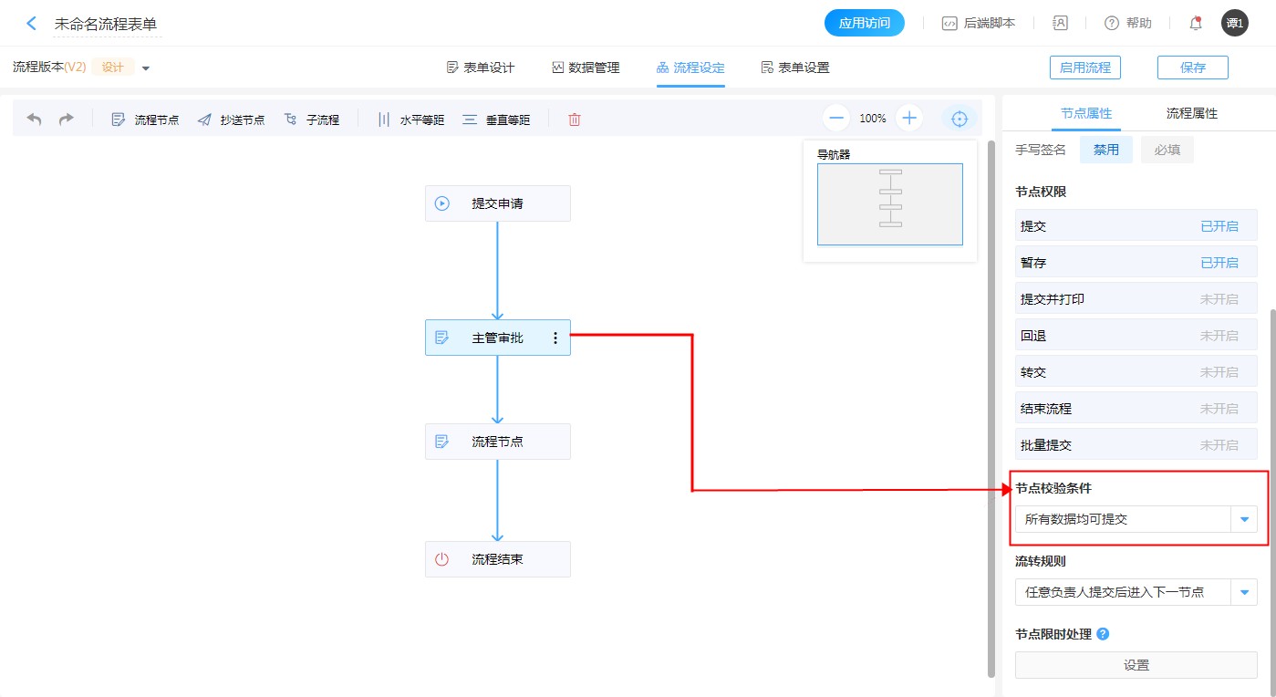 没有节点校验,则只要点击提交数据就无条件往下流转,如果需要节点在只有满足条件的数据才能继续往下流转,可以使用节点校验条件。