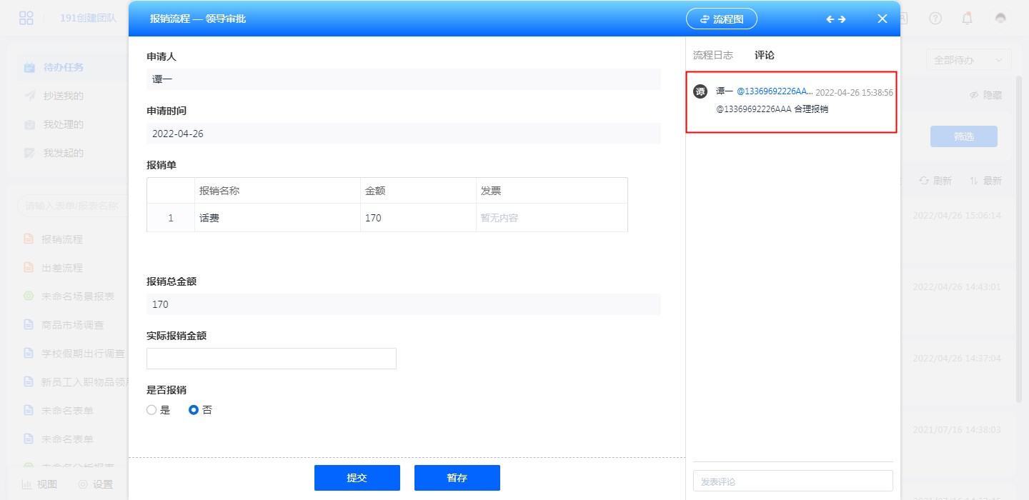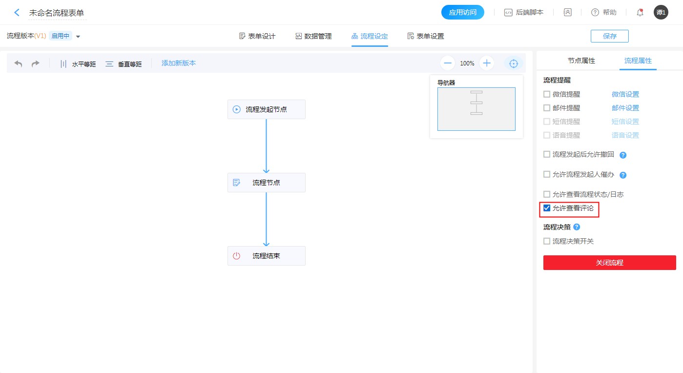 当勾选【允许查看评论】后,在查看流程数据时,可以查看当前数据的平均或对当前流程做出评论。