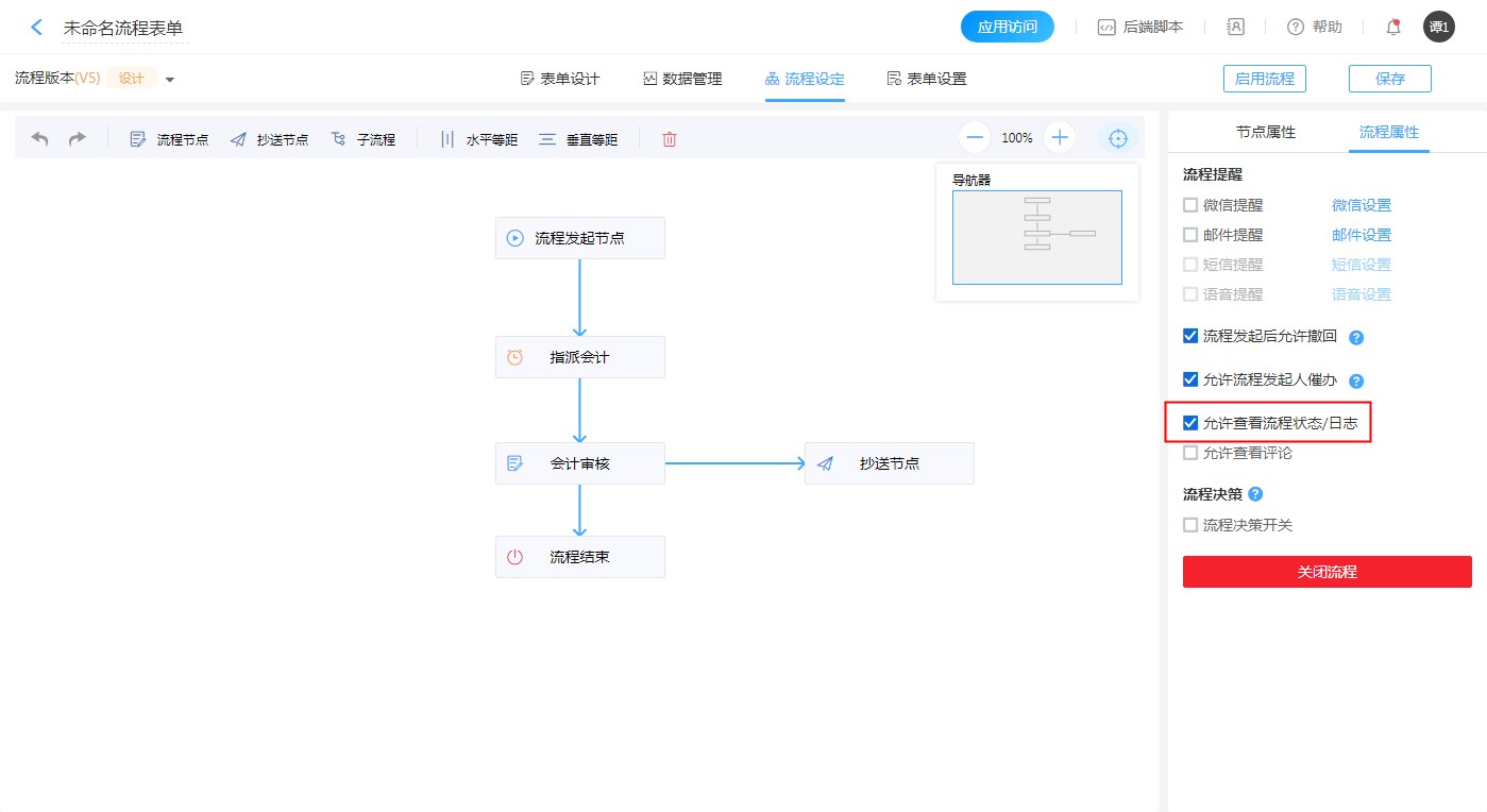 必须在流程属性里先勾选允许查看流程状态/日志,否则不会出现相关按钮,也就意味着无法查看流程状态与日志内容。