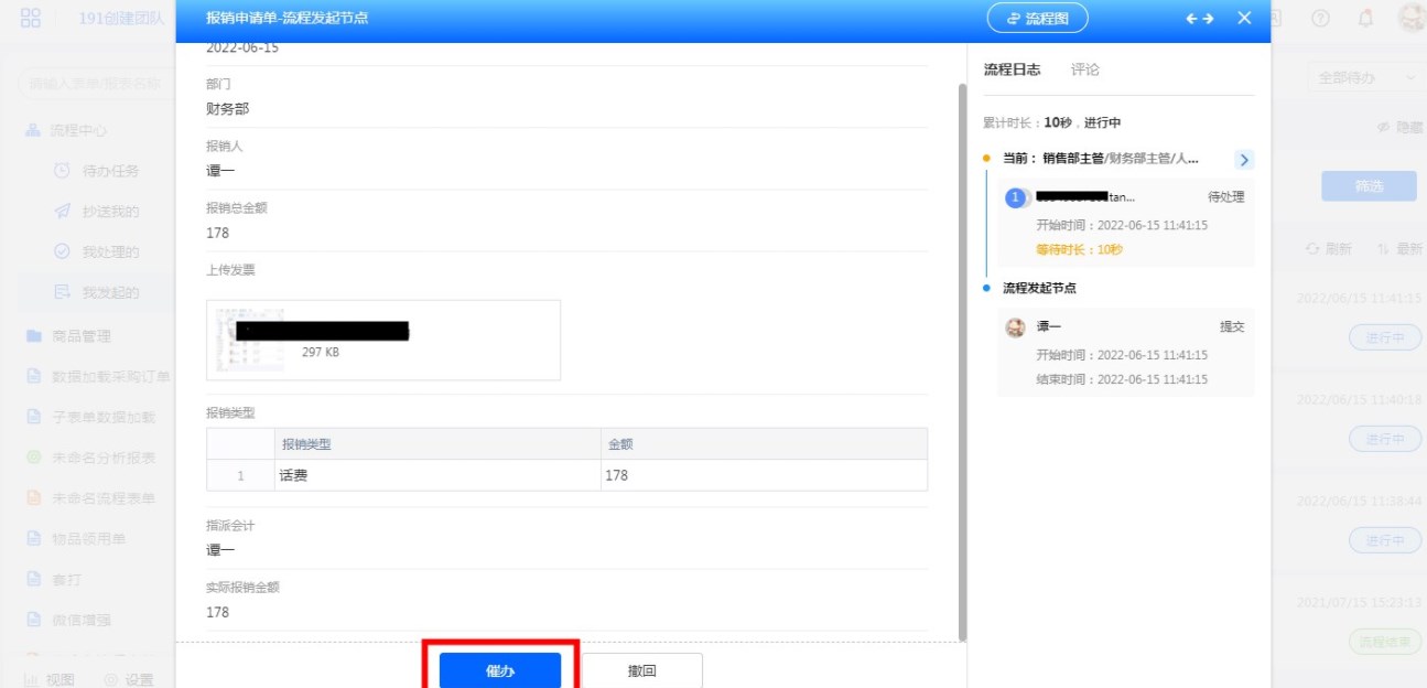 使用流程催办,流程发起人可以在流程负责人未在合适的时间处理流程时,由流程发起人对流程进行催办,催办的流程会直接提醒当前流程节点的负责人。