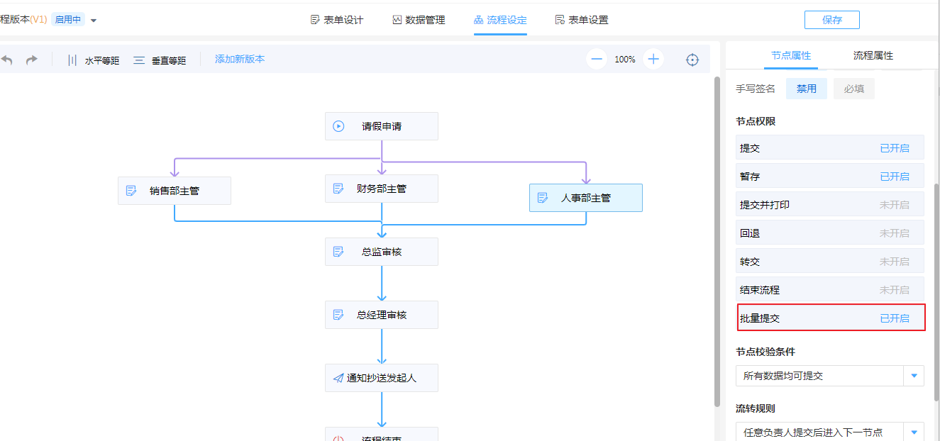 首先需要在流程节点开启批量提交,【流程设定】——【节点属性】——【更多属性】——【开启批量提交】