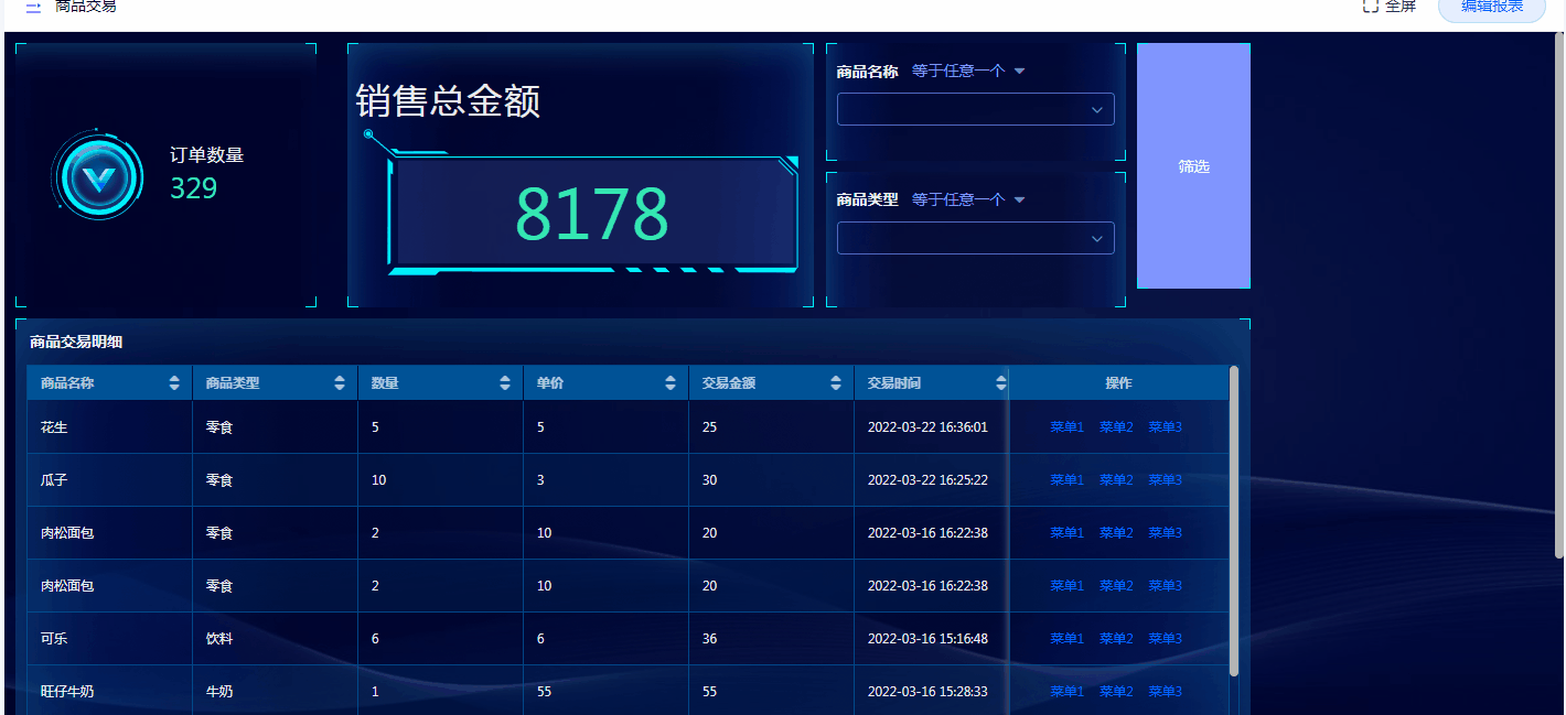 指标适合对重要数据进行直观展示的场景,如:运营分析系统中,公司运营概况报表中就利用透视图的汇总分析功能,对订单数、销量总额等几个关键数据进行了直观展示,无需查看具体数据详情,即可了解订单和销售的情况。