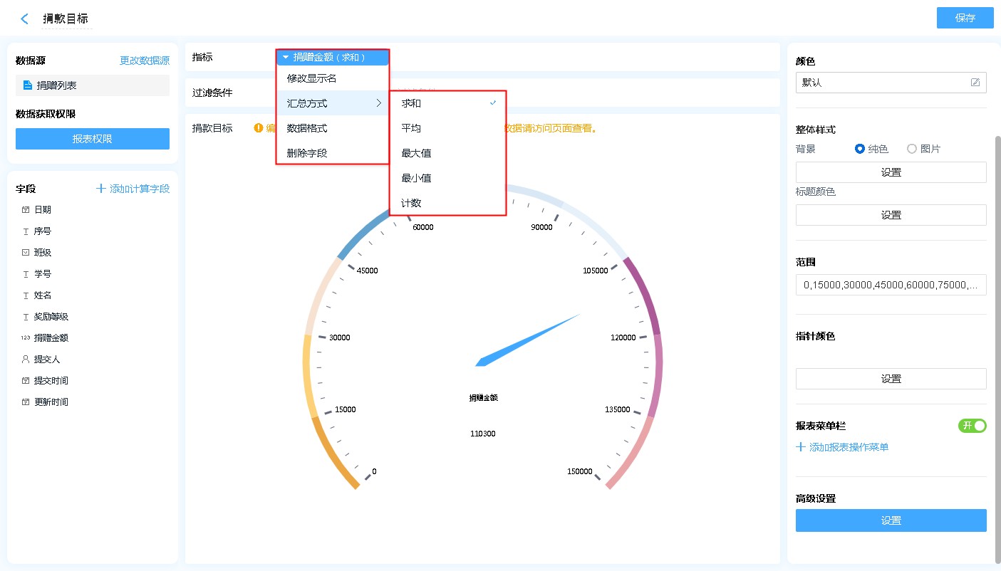 显示名称: 字段添加进入显示字段区域后,可自行修改其在指标图中的表头文字汇总方式: 指标的汇总方式仅支持数字字段,非数字字段在拖入指标中,汇总方式只有计数一项。数据格式:可通过数据格式的设计,在报表中显示自己想要的格式,详见数据格式详解。删除字段:此处的删除字段,是指从指标中删除,删除后仍可重新添加,不会对原表造成任何影响。