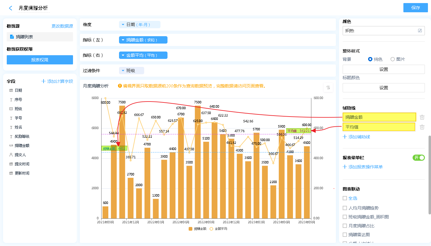 如:分数、身高、成绩、捐赠金额等场景,可以设置其平均值作为参考线,从而得出哪个班级的对应的值超出平均值,哪些班级低于平均值。