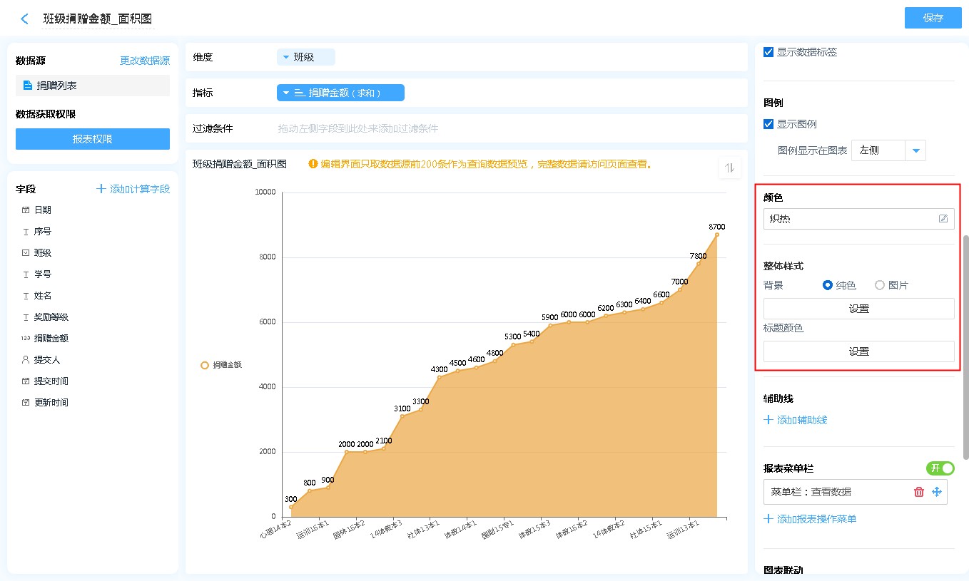 面积图的右侧菜单主要用来对面积图进行各种设置。