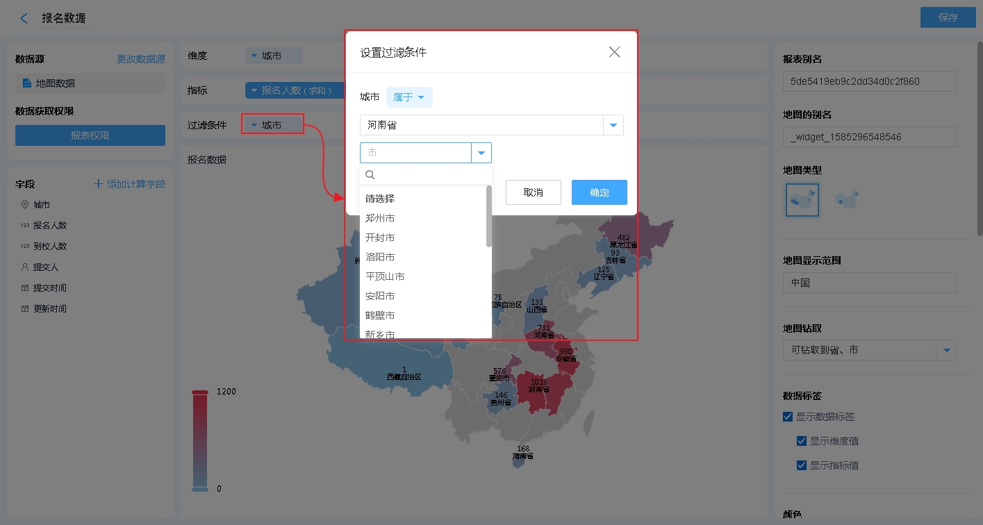 - 显示维度值:在地图上对应的区域显示维度的内容,一般情况下是省/市/县区信息。