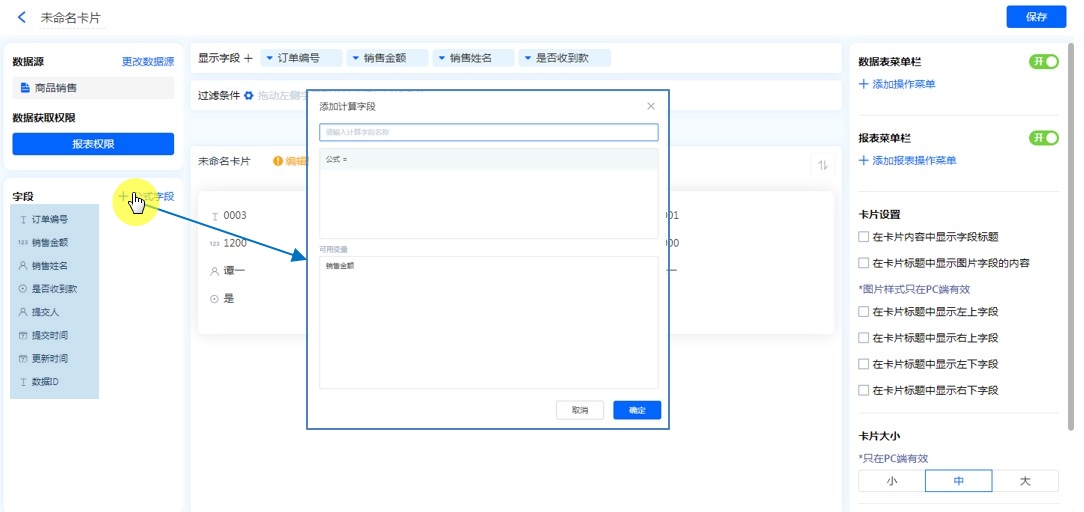 也可以通过增加公式字段,对报表中显示的内容进行简单的计算处理【仅支持+-*/四则运算】。
