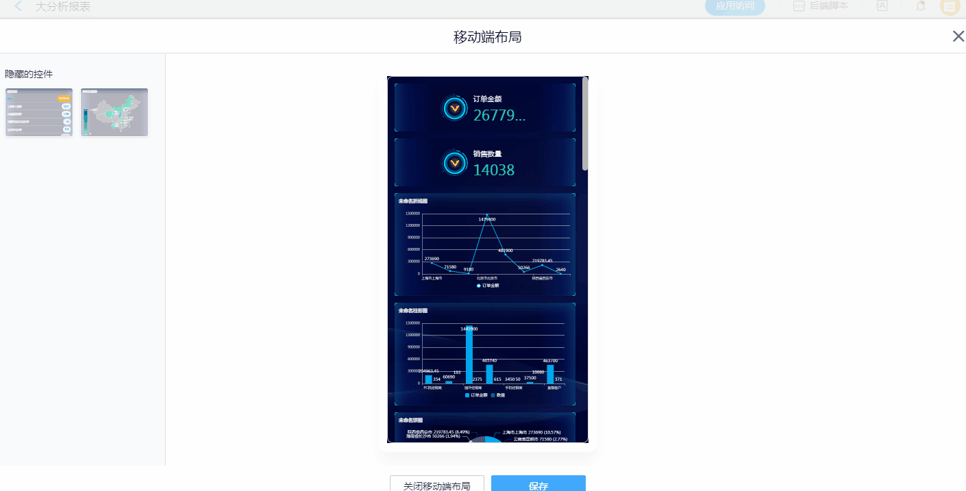 - 在移动布局中,可以自定义各个控件在移动端的展示位置、是否展示。用户可以根据需要,在此处优化报表移动端的排版。