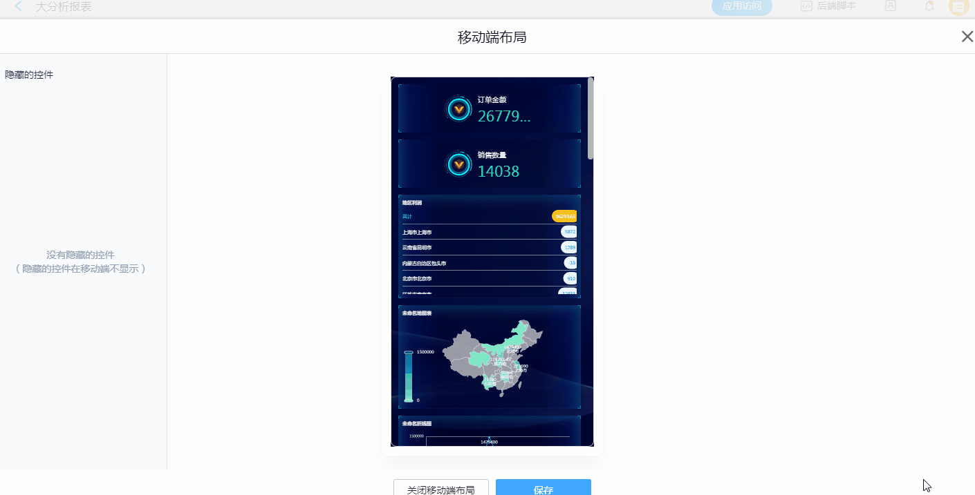 关闭移动布局后,即关闭了在移动布局中的所有设置,移动端访问时,报表按照默认布局展示。