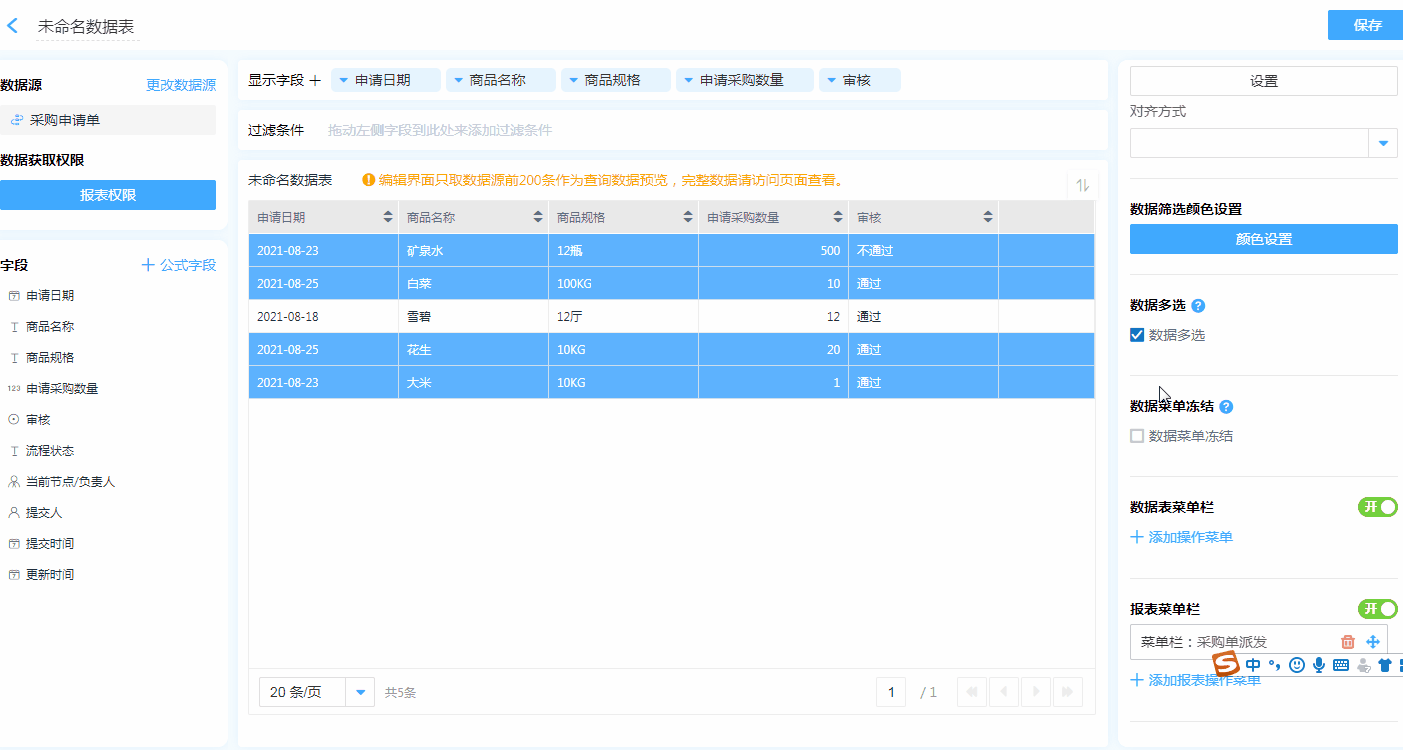 第一步:我们需拖拽一个数据表进行编辑操作,【添加数据源】——【设置显示字段】——【勾选数据多选】