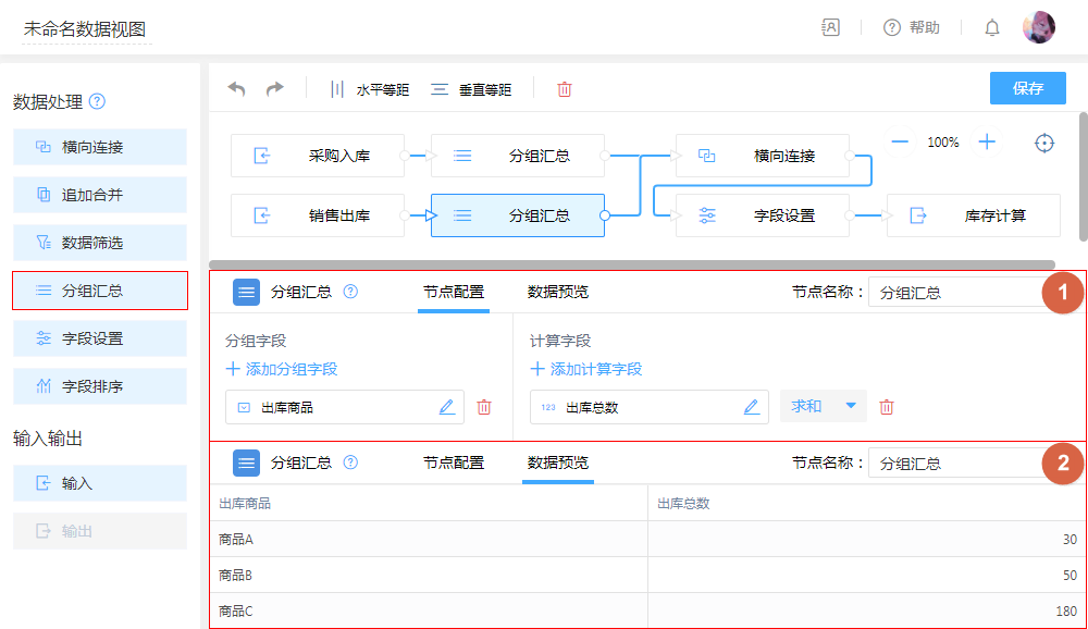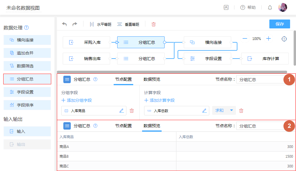 - 配置:分组汇总,对出入数据按“商品”相同的进行汇总出入“总数”。