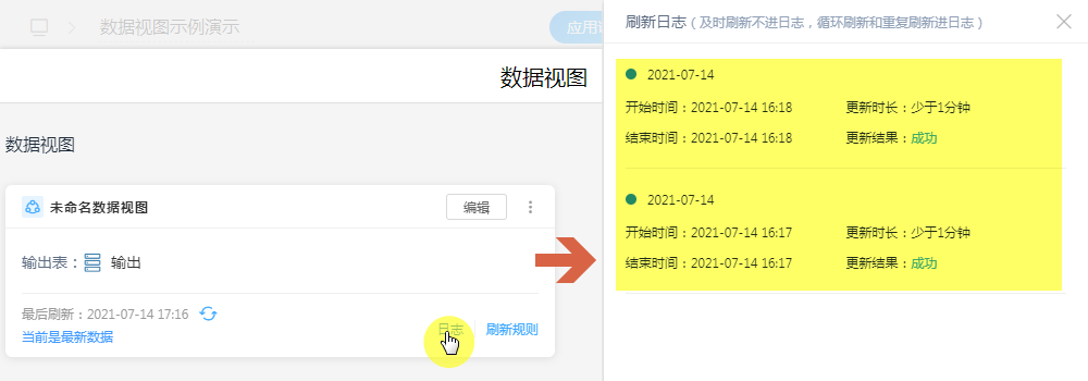 - 展示数据视图的刷新日志,日志显示为30条。
