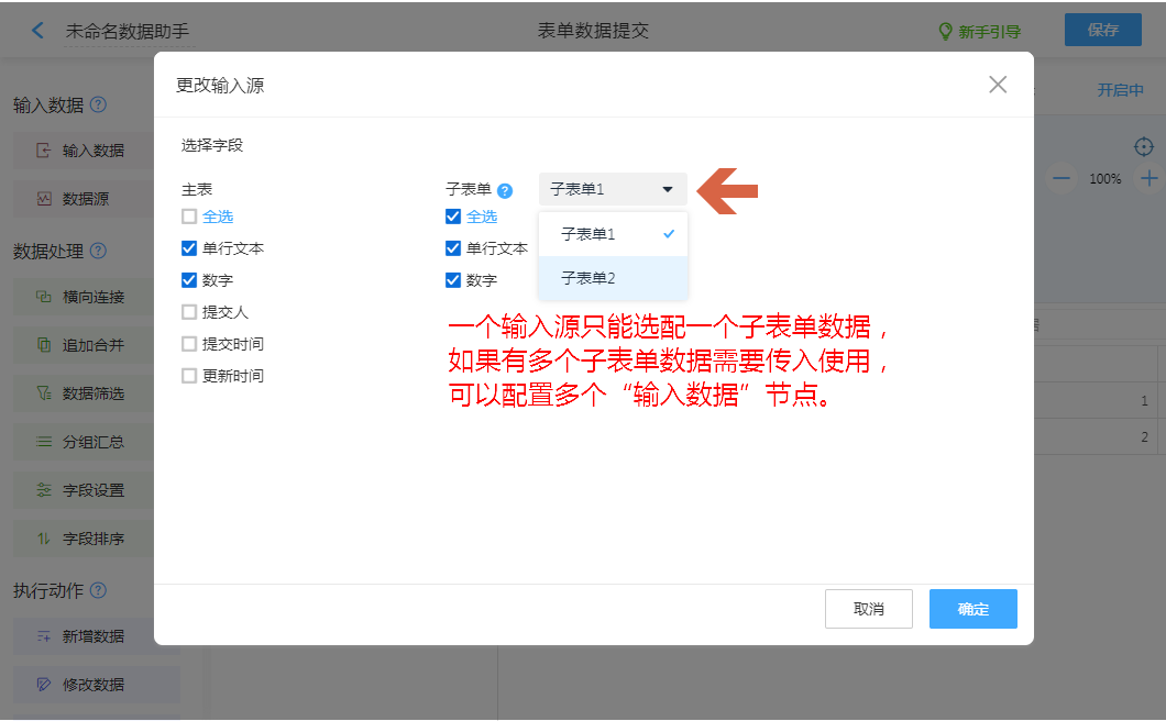 配置当前表单“填写内容”或“表单数据”传入数据助手处理。