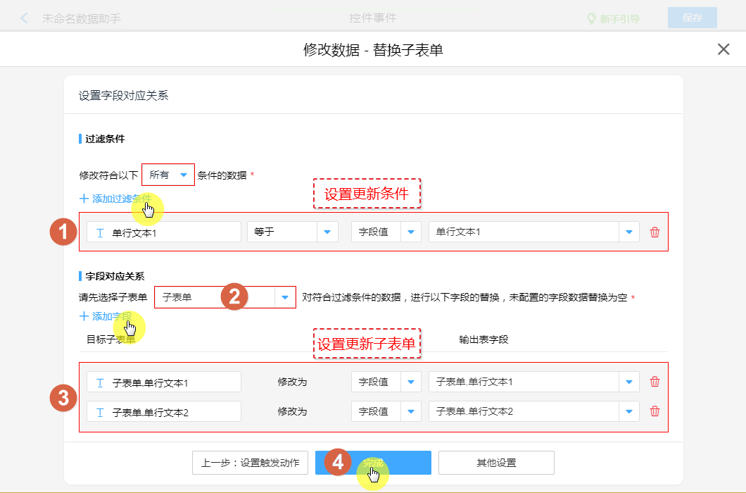 ④、设置子表单更新字段。