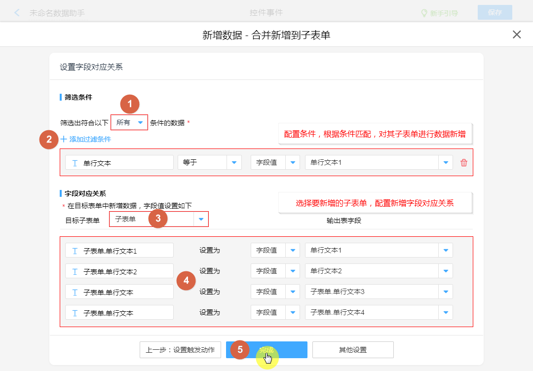 创建“新增数据”动作节点,将“输出表”的数据新增至其他表单。